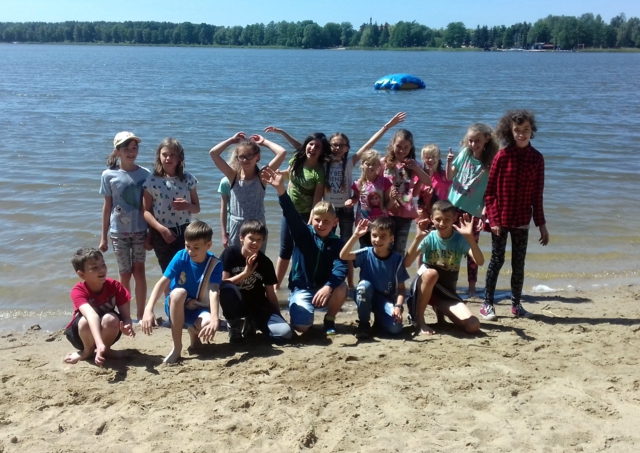 Uczniowie klasy VI i I g wraz ze swoimi wychowawczyniami rozpoczęli świętowanie Dnia Dziecka niebywałą atrakcją - przejażdżką wozami konnymi z Dłużyny do Ośrodka Żeglarskiego w Boszkowie - Letnisku, gdzie czekała na nich kolejna niezapomniana przyjemność – rejs łodzią po urokliwym, otoczonym sosnowymi lasami Jeziorze Dominickim, największym akwenie Pojezierza Leszczyńskiego położonym na terenie Przemęckiego Parku Krajobrazowego. Podczas godzinnego relaksu podziwialiśmy piękno przyrody, łapaliśmy promienie słońca oraz odpoczywaliśmy, aby nabrać sił i energii do zabaw i konkurencji, w których braliśmy udział na terenie ośrodka. Następnie udaliśmy się spacerkiem do „Smażalni ryb” Pana Raszke, gdzie na świeżym powietrzu piekliśmy na grillu smaczne kiełbaski. Nie zabrakło również słodkich niespodzianek, które tam otrzymaliśmy oraz pysznych lodów ufundowanych przez Radę Rodziców.